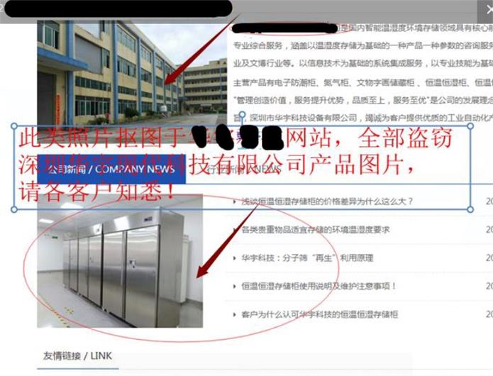 深圳市華宇現(xiàn)代科技有限公司擁有一項(xiàng)恒溫恒濕存儲(chǔ)柜國(guó)家發(fā)明專(zhuān)利,和多項(xiàng)相關(guān)的結(jié)構(gòu)新型及軟著專(zhuān)利。產(chǎn)品廣泛用于外資企業(yè),大企業(yè),企業(yè)集團(tuán),軍工,醫(yī)藥,博物館,檔案館。最近發(fā)現(xiàn)市面有很多貿(mào)易公司或五金生產(chǎn)廠(chǎng)家,在線(xiàn)下或網(wǎng)絡(luò)上盜用我司的產(chǎn)品資料及圖片進(jìn)行不良銷(xiāo)售活動(dòng)。更有甚者以華宇現(xiàn)代的品牌私下接單,但實(shí)際銷(xiāo)售的產(chǎn)品卻是不具備恒溫恒濕功能的非我司產(chǎn)品!(例如和深圳市華宇現(xiàn)代科技有限公司相似名稱(chēng)來(lái)取名以混淆客戶(hù),更有甚者,其網(wǎng)上全部圖片盜用華宇現(xiàn)代產(chǎn)品圖片,以蒙騙客戶(hù)(可以進(jìn)入華宇現(xiàn)代官網(wǎng)www.bxzhd.cn比較即知))